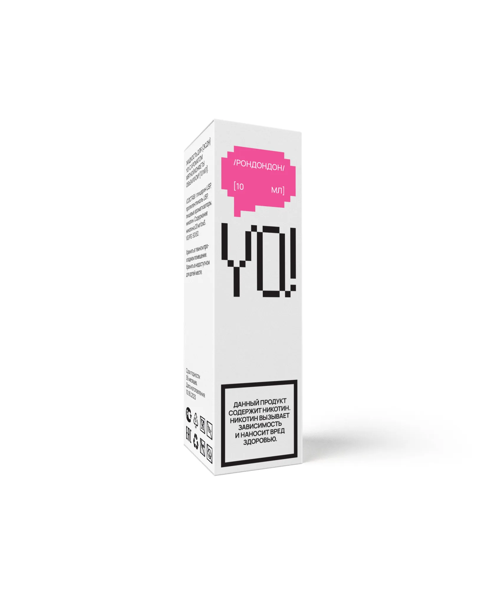 Полное наименование марки YO! – YoVape, что расшифровывается как «Оу, Вейп!». Целью создателей было подчеркнуть дружелюбие, непринужденность и энергичность. Такую тему поддерживает и упаковка, однако подходит к этому нестандартно, сочетая минимализм, скромные белые фоны и яркую геометрию. Дизайн смотрится интригующе и заметно благодаря стильным деталям: активно используются пиксельные игровые рисунки, элементы комиксов и граффити, интерактивные диалоговые окошки, рамки и гипно-полоски.